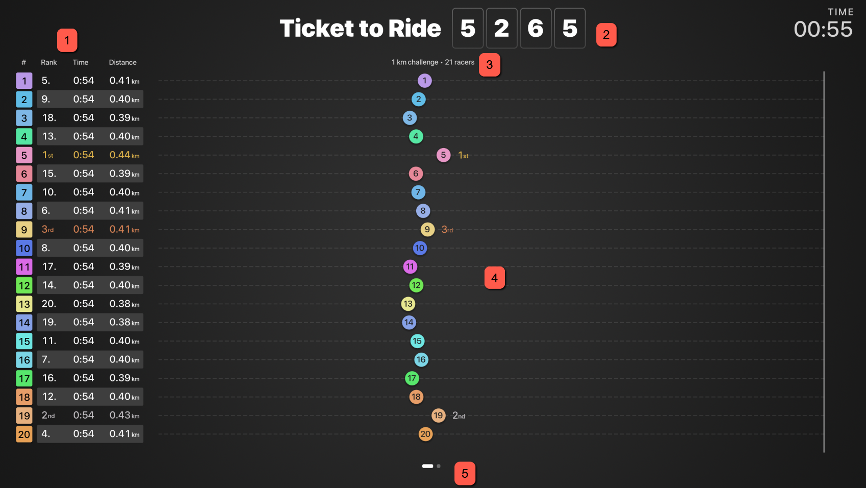 - Race progress showing each rider’s position; the top 3 are marked as 1st, 2nd, and 3rd.